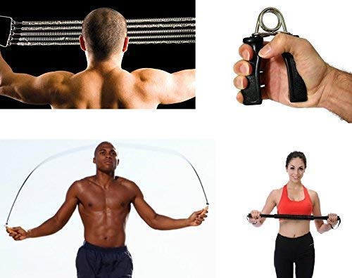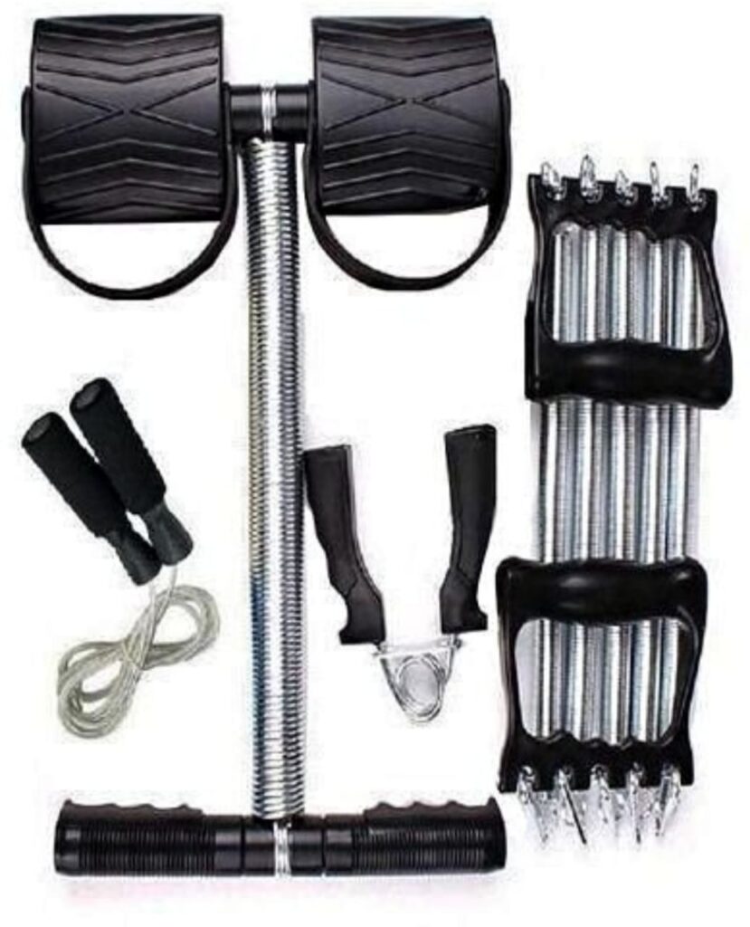 Comes with the jump rope, handgrip, and spring action power.